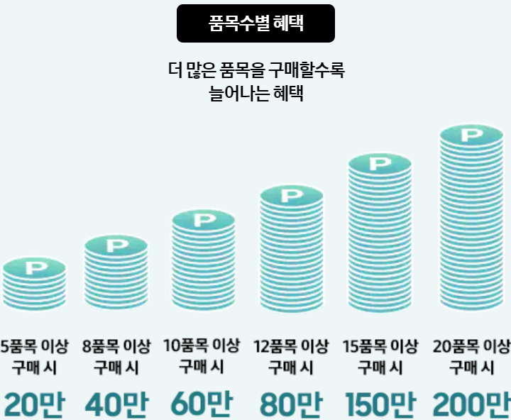 더 많은 품목을 구매할수록 포인트 혜택은 늘어납니다. (최대 200만 포인트)