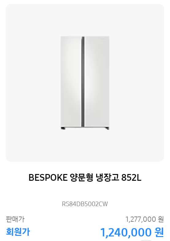 2) 비스포크 냉장고 4도어 (852L): 일반 카드가 3,100,000원 ➔ 삼성카드 할인 2,960,000원