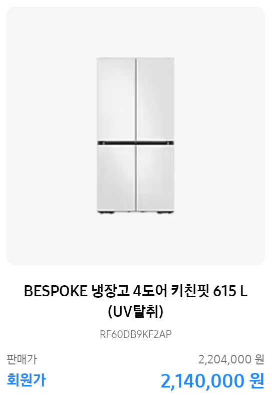 3) 비스포크 냉장고 키친핏 4도어 (597L): 일반 카드가 3,000,000원 ➔ 삼성카드 할인 2,860,000원